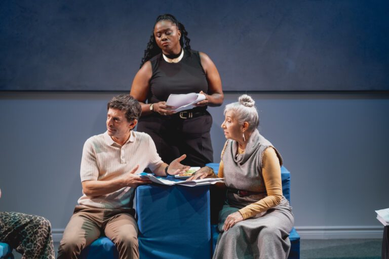 Today, they’re working on the final 24 bars of “Love You Like A Table,” a comedic wedding vow duet sung by quirky tax auditor Ogie (Tyler Pearse) and eccentric waitress Dawn (Elysia Cruz), featuring the ensemble on doo-wop background vocals. Genny begins the session not by teaching steps, but by gathering the cast in a huddle to discuss each character’s emotional arc. She leads with curiosity and invites collaboration. Most of her directions are phrased as offers: “Could we try this?,” “Does that feel right?”