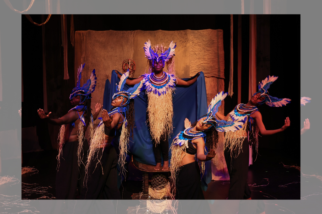 benu carries the story forward with the tale of Sekusu Sankofa, Mudgu’s daughter. Brought from Jamaica to Canada as a child, she is now a mother to infant Benu and suffers from postpartum depression. Forbes’ set design for benu is similar to that of blood.claat, albeit with a cobalt blue palette. Dixon’s costume design dazzles most brilliantly here: the Posse dons masks made to resemble beaks, embellished with blue beads and shells, along with chest pieces made of feathers and straw. Their movements are gawky and twitchy, emulating birds.