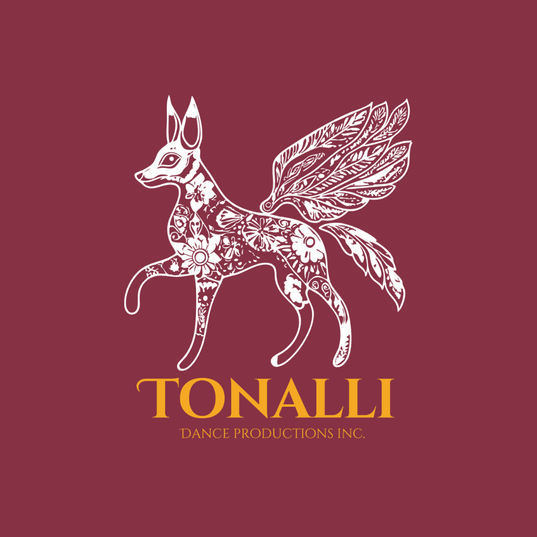 A white illustration of a xoloitzcuintli (Mexican hairless dog) painted with traditional Day of the Dead makeup, a pair of wings, and a feathered tail against a maroon background. Bold yellow text below the xoloitzcuintli reads: "Tonalli Dance Productions Inc."